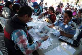 JOJUTLA, MORELOS,24 NOVIEMBRE 2017.-Inicio la entrega del apoyo federal del Fondo Nacional de Desastres Naturales (FONDEN) en la cuidad que resulto más dañada durante el sismo del pasado 19 de septiembre. Brigadistas de la Secretaria de Desarrollo Agrario, Territorial y Urbano (SEDATU) y del Banco del Ahorro Nacional y Servicios Financieros (BANSEFI) entregan dos tarjetas a los damnificados, una con 90 mil pesos para compra de material de construcción y otra con 30 mil pesos para mano de obra u otra necesidad que tengan. FOTO: MARGARITO PÉREZ RETANA/CUARTOSCURO.COM
