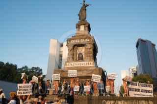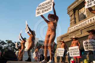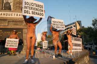 CIUDAD DE MÉXICO, 25NOVIEMBRE2017.- Integrantes de los 400 pueblos se manifestaron en el Monumento a Cuauhtémoc en Paseo de la Reforma. Como es costumbre en las protestas de la organización, al ritmo de la música los quejosos se quitaron la ropa para bailar y solicitar la atención de las autoridades. FOTO: ANDREA MURCIA /CUARTOSCURO.COM