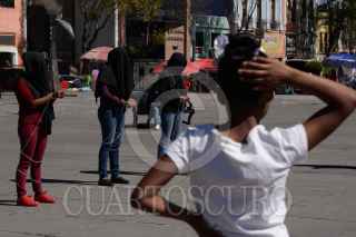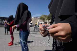 TOLUCA, ESTADO DE MÉXICO, 28NOVIEMBRE2017.- A unos días de haberse conmemorado el Día Internacional de la Eliminación de la Violenvia Contra la Mujer, integrantes de la Red por los Derechos Sexuales y Reproductivos en Mexico (DDESER) realizaron un performance en la Plaza Ángel María Garibay, exigiendo despenalizar el aborto en el Estado de México. FOTO: ARTEMIO GUERRA BAZ/CUARTOSCURO.COM