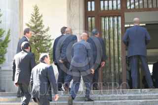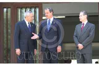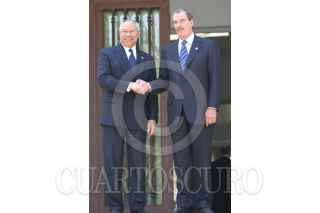 MEXICO D.F 9 NOVIEMBRE 2004.- Colin Powell secretario del Estado estadounidense, saluda al presidente Vicente Fox Quesada y a Luis Ernesto Derbez secretario de Relaciones Exteriores durante la recepción oficial en la residencia oficial de Los Pinos. FOTO: Eunice Adorno/CUARTOSCURO.COM