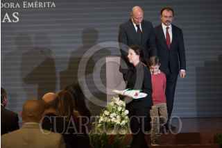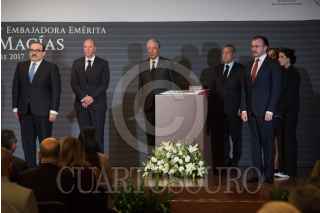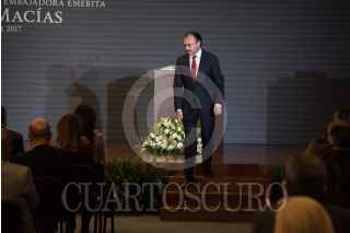 CIUDAD DE MÉXICO, 04DICIEMBRE2017.- Luis Videgaray, secretario de Relaciones Exteriores, encabezó el Homenaje Luctuoso de la Embajadora Emérita Rosario Green Macías, Ex Canciller de México, en el salón José María Morelos y Pavón de la Secretaría de Relaciones Exteriores. En la imagen, el canciller, entregó reconocimientos a Gabriel y Daniela, hijos de Rosario Green. FOTO: MARIO JASSO /CUARTOSCURO.COM