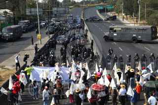 CIUDAD DE MÉXICO, 05DICIEMBRE2017.- Policías amtimotines bloquearon el paso a centenares de organizaciones campesinas que pretendían manifestarse en las inmediaciones del Aeropuerto Internacional de la Ciudad de México. FOTO: SAÚL LÓPEZ /CUARTOSCURO.COM