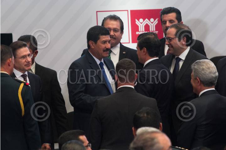 CIUDAD DE MÉXICO, 04DICIEMBRE2017.- Javier Corral, gobernador de Chihuahua, y Enrique Peña Nieto, Presidente de México, conversan al finalizar la Asamblea General del Infonavit, en su sede general. FOTO: MOISÉS PABLO /CUARTOSCURO.COM