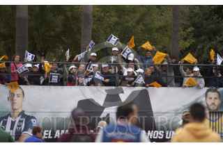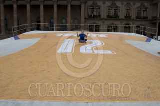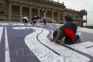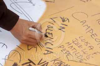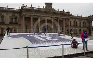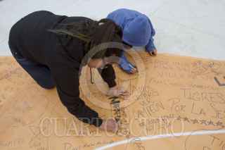 MONTERREY, NUEVO LEÓN, 06DICIEMBRE2017.- Colocan en la Explanada de los Héroes mega playeras de los equipos de futbol Tigres y Rayados para llamar a la afición a la convivencia pacífica. Los aficionados pueden escribir en las camisas palabras alusivas a fomentar la paz en los partidos de la final de la Liga MX. FOTO: GABRIELA PÉREZ MONTIEL /CUARTOSCURO.COM