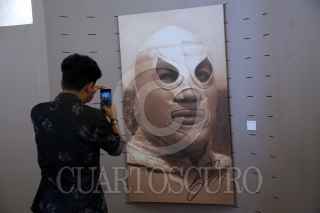 PUEBLA, PUEBLA; 06DICIEMBRE2017.- El hijo del Santo en compañía de la diseñadora Desirée Navarro, presidenta de la fundación Lozano y el presidente municipal de Puebla Luis Banck, realizaron la presentación y recorrido de la exposición de la colección privada "Cien Años del Santo" en la casa de cultura de la ciudad. FOTO: HILDA RÍOS/ CUARTOSCURO.COM