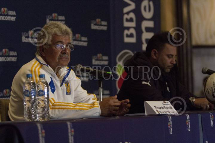 MONTERREY, NUEVO LEÓN, 06DICIEMBRE2017.- Los directores técnicos de los equipos de la final de la Liga MX, Apertura 2017; Ricardo Ferreti de Tigres y Antonio Mohamed de Monterrey ofrecen una rueda de prensa previo al partido de ida en el estadio Universitario. En la sala de prensa, presentaron la copa. FOTO: GABRIELA PÉREZ MONTIEL /CUARTOSCURO.COM