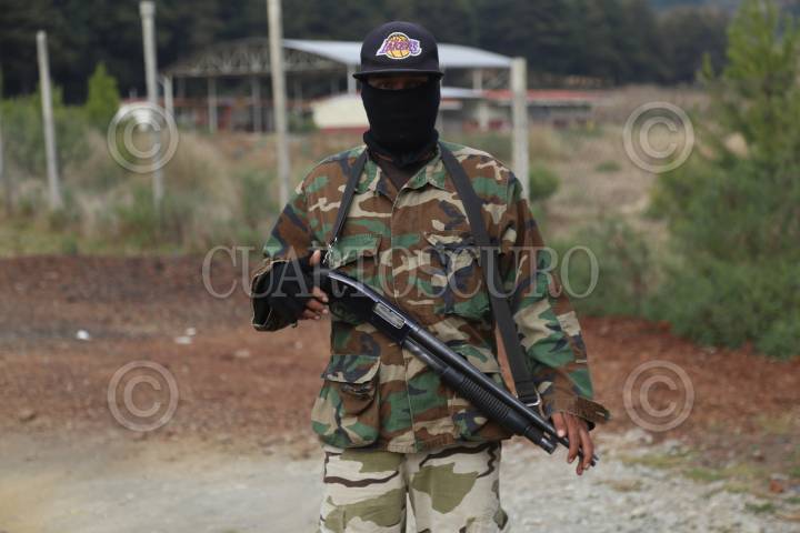 PARACHO, MICHOACÁN. 07DICIEMBRE2017. Integrantes de la Ronda Comunitaria del pueblo de Nurio, realizan tareas de vigilancia en una de las entradas del pueblo, hace más de dos años que mediante un acuerdo de la asamblea comunal, máxima autoridad de la comunidad, se creó este grupo de comuneros quienes realizan patrullajes dentro de su territorio para cuidar y proteger sus bosques. La ola de inseguridad que se vive en el estado, ha provocado que varios pueblos formen sus propios cuerpos de seguridad y que estén realizando labores de vigilancia a la sombra de las autoridades quien en los últimos días ha criminalizado. FOTO: JUAN JOSÉ ESTRADA SERAFÍN / CUARTSCURO.COM