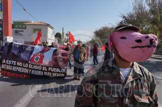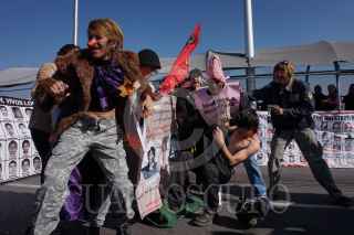CIUDAD JUÁREZ, CHIHUAHUA, 16DICIEMBRE2017.- Organizaciones civiles, músicos, artistas y ciudadanos hicieron una manifestación en el Puente Internacional Santa Fe, que conecta a Ciudad Juárez con El Paso, Texas, en contra de la aprobación de la Ley de Seguridad Interior. El contingente de alrededor de 50 personas, marchó por las principales avenidas del Centro Histórico haciendo paradas en la Oficina de Enlace Legislativo de la Senadora Lilia Merodio y en las de los Comités Municipales del PRD y del PAN. FOTO: FAVIA LUCERO /CUARTOSCURO.COM