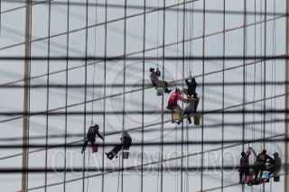 CIUDAD DE MÉXICO, 17DICIEMBRE2017.- Un grupo de limpiavidrios cuelgan de uno de los hoteles de la zona de Polanco. FOTO: GALO CAÑAS /CUARTOSCURO.COM