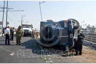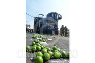 CIUDAD DE MÉXICO, 18DICIEMBRE2017.- Tras una persecución un camión cargada de frutas y verduras terminó volcada en el puente vehicular del Eje 3 Oriente Arneses y la Avenida Taxqueña, en la colonia San Francisco Culhuacán. El conductor fue detenido. FOTO: ARMANDO MONROY /CUARTOSCURO.COM