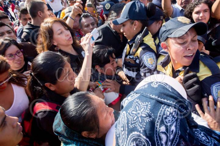 CIUDAD DE MÉXICO, 26DICIEMBRE2017.- Policías y familiares de los 43 normalistas desaparecidos de Ayotzinapa, se dieron de jaloneos al concluir la marcha en la Basilica, debido a que los oficiales de tránsito les bloquearon el acceso a la Iglesia. FOTO: TERCERO DÍAZ /CUARTOSCURO.COM