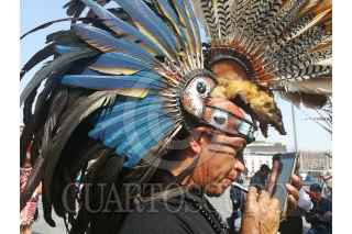 CIUDAD DE MÉXICO, 29DICIEMBRE2017.- Un danzante se retoca su indumentaria con la ayuda de su celular en el zócalo. FOTO: MOISÉS PABLO /CUARTOSCURO.COM