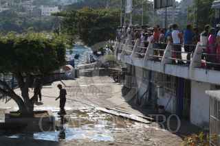ACAPULCO, GUERRERO, 01ENERO2018.- Turistas esperan para abordar los yates de paseos que se encuentran en el el hotel Fiesta de Bonanza, sin embargo, durante su espera tienen que soportar los fétidos olores de las aguas negras del drenaje que salen de una coladera. FOTO: BERNANDINO HERNÁNDEZ /CUARTOSCURO.COM