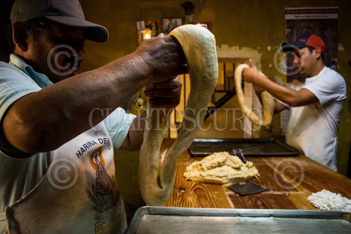 ZACATECAS, ZACATECAS, 05ENERO2018.- Don Nicolás Ramírez Espinoza de 61 años y su hijo Santos Ramírez de la Torre de 30, trabajan en la elaboración de la tradicional rosca de reyes, la cual es muy requerida en estas fechas por vecinos y clientes de la panadería "Don Santos", negocio que en octubre próximo cumplirá 50 años de abrir sus puertas a los más exigentes paladares en cuanto a este alimento básico se refiere. Este pequeño negocio ubicado en el callejón de la mantequilla no. 209, en el centro histórico de la capital zacatecana, trabaja desde hace 8 años con la ausencia del maestro panadero y fundador Don Santos Ramírez Ibarra, quien enseño a su hijo y nieto la elaboración artesanal de este alimento como una tradición familiar que por años ha perdurado. Ellos al igual que miles de comerciantes del estado, se ven afectados por el incremento de los combustibles ya que aumentan los precios de los insumos básicos considerablemente; solo en 8 días el precio del huevo paso de estar de $540 a $624 pesos y la manteca de $560 a $665 pesos, solo por mencionar dos insúmos necesarios para la elaboración de la rosca de reyes, que este año oscila entre los $220 y $100 pesos dependiendo el tamaño. Don Nicolás y su hijo Santos, prefieren calidad que cantidad, así que son fieles a la elaboración artesanal de este alimento. FOTO: MISAEL VALTIERRA / CUARTOSCURO.COM