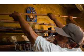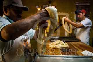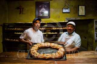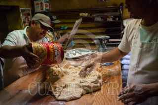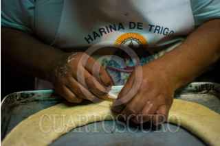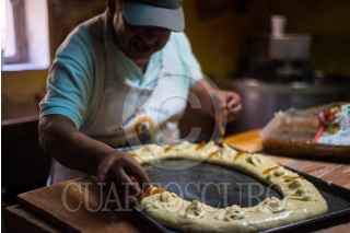 ZACATECAS, ZACATECAS, 05ENERO2018.- Don Nicolás Ramírez Espinoza de 61 años y su hijo Santos Ramírez de la Torre de 30, trabajan en la elaboración de la tradicional rosca de reyes, la cual es muy requerida en estas fechas por vecinos y clientes de la panadería "Don Santos", negocio que en octubre próximo cumplirá 50 años de abrir sus puertas a los más exigentes paladares en cuanto a este alimento básico se refiere. Este pequeño negocio ubicado en el callejón de la mantequilla no. 209, en el centro histórico de la capital zacatecana, trabaja desde hace 8 años con la ausencia del maestro panadero y fundador Don Santos Ramírez Ibarra, quien enseño a su hijo y nieto la elaboración artesanal de este alimento como una tradición familiar que por años ha perdurado. Ellos al igual que miles de comerciantes del estado, se ven afectados por el incremento de los combustibles ya que aumentan los precios de los insumos básicos considerablemente; solo en 8 días el precio del huevo paso de estar de $540 a $624 pesos y la manteca de $560 a $665 pesos, solo por mencionar dos insúmos necesarios para la elaboración de la rosca de reyes, que este año oscila entre los $220 y $100 pesos dependiendo el tamaño. Don Nicolás y su hijo Santos, prefieren calidad que cantidad, así que son fieles a la elaboración artesanal de este alimento. FOTO: MISAEL VALTIERRA / CUARTOSCURO.COM