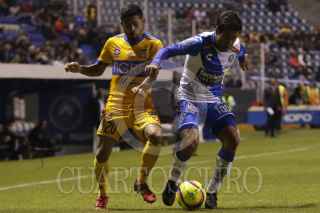 PUEBLA, PUEBLA 05ENERO2018.- Los jugadores Pablo González y Javier Aquino disputan el balón en jugada correspondiente al partido de la jornada 1 del torneo Clausura 2018 de la Liga MX celebrado en el estadio Cuauhtémoc con marcador final 2-1 a favor de los locales. FOTO: HILDA RÍOS/CUARTOSCURO.COM