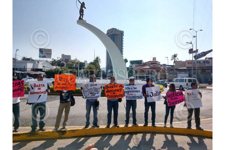 ACAPULCO, GUERRERO, 09ENERO2018.- Periodistas de Acapulco protestaron encontra de las agresiones que sufrió el reportero gráfico Bernandino Hernández, quien fue golpeado por elementos de la Policía Estatal cuando se encontraba cubrir dos un violento desalojo en San Pedro Cacahuatepec. Los comunicadores exigieron al gobierno local un alto a la intimidaciones por parte de los cuerpos policíacos, el puerto de Acapulco se ha convertido en uno de los sitios más violentos del país en los últimos años. FOTO: CUARTOSCURO.COM