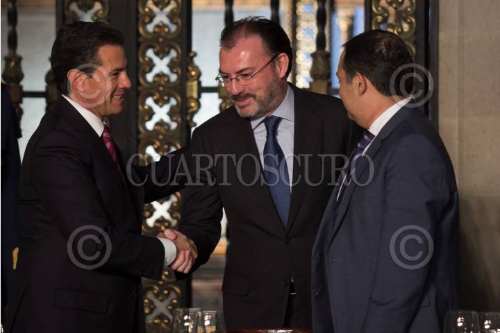 CIUDAD DE MÉXICO, 11ENERO2018.- El presidente Enrique Peña Nieto, Ernesto Cordero, presidente del Senado, y Luis Videgaray Caso, secretario de Relaciones Exteriores, durante la Reunión de Embajadores y Cónsules de México, en Palacio Nacional. FOTO: GALO CAÑAS /CUARTOSCRO.COM