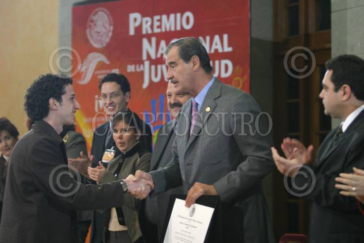 MEXICO, D.F. 16DICIEMBRE2004.- Reyes Tamez Guerra, secretario de Educación Pública; Vicente Fox, Presidente de la República; Cristian Castañón Contreras, director general del Instituto Mexicano de la Juventud y Sari Bermudez, titular de CONACULTA, durante la ceremonia de entrega del Premio Nacional de la Juventud, en la residencia oficial de los Pinos. FOTO: Nelly Salas/CUARTOSCURO.COM