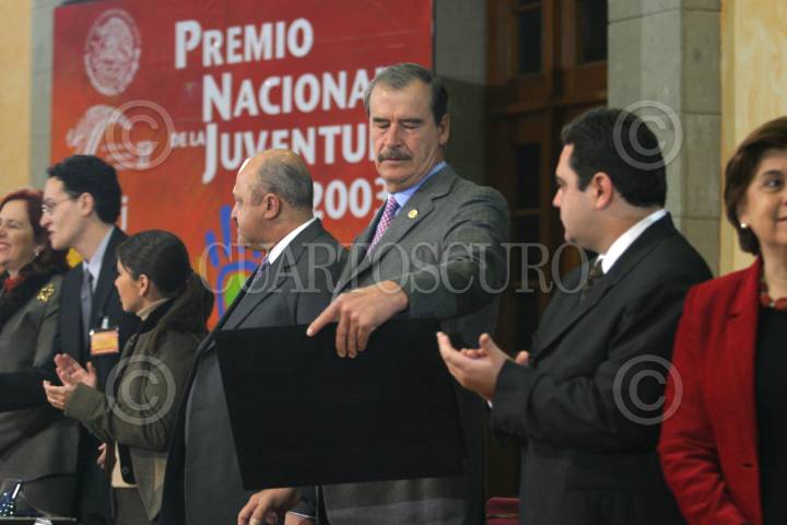 MEXICO, D.F. 16DICIEMBRE2004.- Reyes Tamez Guerra, secretario de Educación Pública; Vicente Fox, Presidente de la República; Cristian Castañón Contreras, director general del Instituto Mexicano de la Juventud y Sari Bermudez, titular de CONACULTA, durante la ceremonia de entrega del Premio Nacional de la Juventud, en la residencia oficial de los Pinos. FOTO: Nelly Salas/CUARTOSCURO.COM
