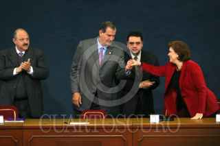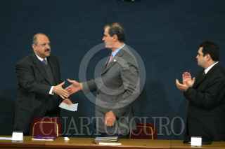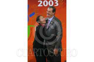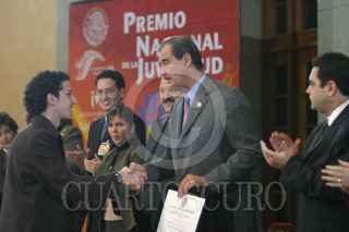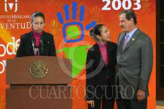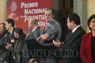 MEXICO, D.F. 16DICIEMBRE2004.- Reyes Tamez Guerra, secretario de Educación Pública; Vicente Fox, Presidente de la República; Cristian Castañón Contreras, director general del Instituto Mexicano de la Juventud y Sari Bermudez, titular de CONACULTA, durante la ceremonia de entrega del Premio Nacional de la Juventud, en la residencia oficial de los Pinos. FOTO: Nelly Salas/CUARTOSCURO.COM