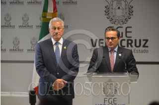 XALAPA, VERACRUZ, 15ENERO2018.- En conferencia de prensa el fiscal Jorge Winckler acompañado del secretario de la SSP, Jaime Téllez Marié, dieron a conocer el rescate de MGEG con identidad resguardada en la zona conurbada Veracruz-Boca del Río, quien era víctima de secuestro, además de mencionar que ya identificaron a las personas que fueron descuartizadas, las cuales fueron halladas al interior de una camioneta el sábado por la noche. FOTO: ALBERTO ROA /CUARTOSCURO.COM
