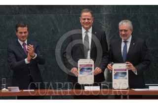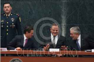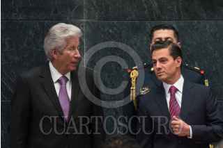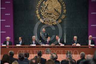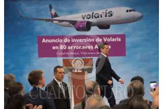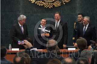 CIUDAD DE MÉXICO, 16ENERO2018.- El presidente Enrique Peña Nieto; Gerardo Ruiz Esparza, secretario de Comunicaciones y Transportes; Enrique Beltranena, CEO y miembro del Consejo de Administración de Volaris, e Ildefonso Guajardo, secretario de Economía, durante el anuncio de la marca aerea “Volaris” en adquirir 80 aeronaves “Airbus”. FOTO: MARIO JASSO /CUARTOSCURO.COM