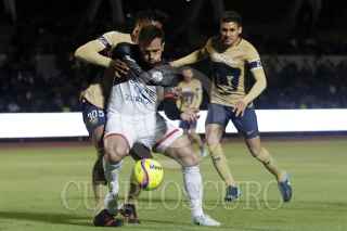 PUEBLA, PUEBLA, 17ENERO2018.- Los jugadores Jerónimo Amione y Diego Rodríguez disputan el balón durante jugada del partido entre Lobos BUAP y Pumas de la UNAM con marcador final 2-0 a favor de los locales en juego correspondiente a la jornada 2 de la Copa MX celebrado en el estadio Universitario de la BUAP. FOTO: HILDA RÍOS/CUARTOSCURO.COM