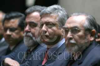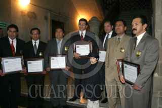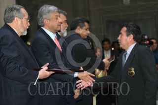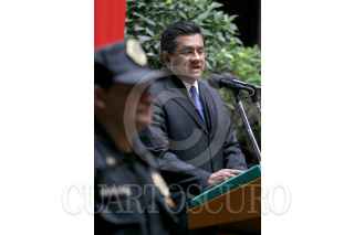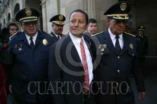 MEXICO, D.F. 20DICIEMBRE2004.- Joel Ortega, secretario de Seguridad Pública del D. F., Alejandro Encinas, secretario de gobierno del D. F., Andrés Manuel López Obrador, jefe de gobierno de la ciudad de México y Bernardo Batíz, procurador de justicia del D.F. durante la ceremonia de entrega de reconocimientos a policias por su destacada labor en el cumplimiento de su deber. FOTO: Nelly Salas/CUARTOSCURO.COM