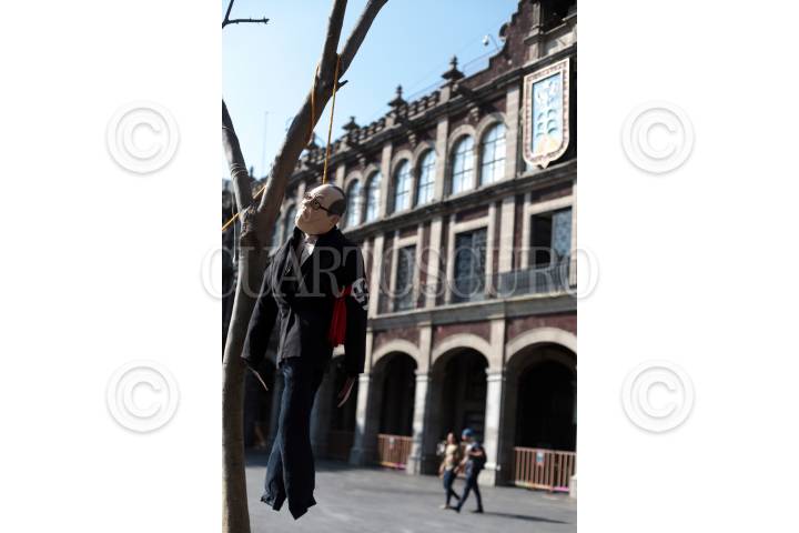 CUERNAVACA, MORELOS, 24ENERO2018.- Activistas del Frente Amplio Morelense se manifestaron esta mañana en el zócalo de la ciudad colgando de un árbol un monigote que representa al gobernador Graco Ramírez Abreu; al que acusan de perseguir políticamente al ex rector de la Universidad de Morelos, que la tarde de ayer fue detenido por elementos de la Fiscalía Anticorrupción y liberado 6 horas después. FOTO: MARGARITO PÉREZ RETANA /CUARTOSCURO.COM