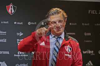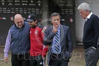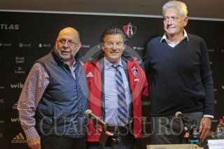 ZAPOPAN, JALISCO, 25ENERO2018.- Gustavo Guzmán Sepúlveda Presidente del Atlas y Alberto de la Torre Vicepresidente Deportivo del club, fueron los encargados de llevar a cabo la presentación de Rubén Omar Romano como nuevo Director Técnico de los Rojinegros del Atlas para el Torneo Clausura 2018 de la Liga MX, dicho evento se llevó a cabo en las instalaciones de la Madriguera. FOTO: FERNANDO CARRANZA GARCIA / CUARTOSCURO.COM