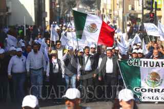 PARRAS, COAHUILA, 27ENERO2018.- Cientos de personas acompañaron la marcha que inició en la Alameda, a las afueras de Saltillo, hasta llegar a la Plaza de Armas, en un recorrido de poco más de un kilómetro, en el que los habitantes de ésta y poblaciones aledañas corearon su apoyo al Gobernador Javier Corral y a la Caravana por la Dignidad Unidos con Valor. FOTO: CUARTOSCURO.COM