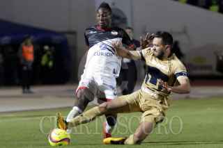 PUEBLA,PUE., 27ENERO2018.- Los jugadores Julián Quiñones y Omar Mendoza disputan el esférico durante el partido entre los clubes Lobos BUAP y Pumas de la UNAM correspondiente a la jornada 4 del torneo Clausura 2018 de la Liga MX, el cual concluyó con un marcador final de 1-1. FOTO: HILDA RÍOS/CUARTOSCURO.COM