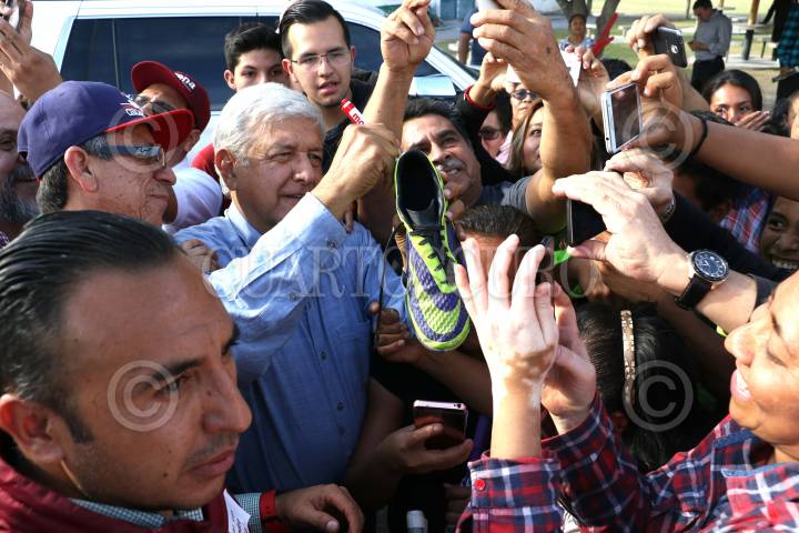 IZUCAR DE MATAMOROS, PUEBLA 02FEBRERO2018.- Andrés Manuel López Obrador, precandidato a la presidencia de la república del Movimiento de Regeneración Nacional visitó la región de la mixteca poblana en compañía del precandidato a la gubernatura del estado Miguel Barbosa Huerta, donde dieron a conocer su propuesta de gobierno ante miles de militantes de MORENA en la unidad deportiva Mariano Matamoros. FOTO: SAÚL LÓPEZ /CUARTOSCURO.COM