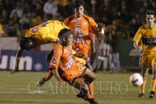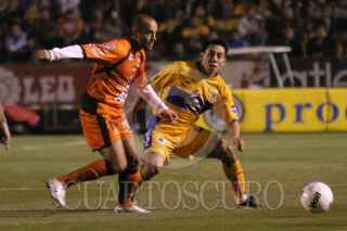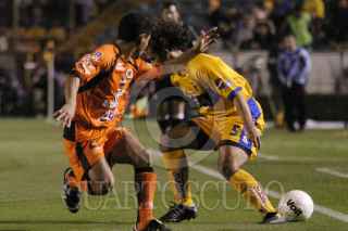 MONTERREY, N.L. 15 DE ENERO DE 2005.- Sergio Almaguer (D) de Chiapas marcando al jugador de Tigres Irenio Soarez (I) durante el juego de la jornada 1 del Torneo de Clausura 2005. FOTO:Jorge López/CUARTOSCURO.COM