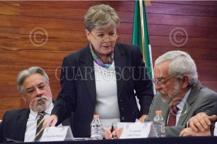 CIUDAD DE MÉXICO, 12FEBRERO2018.- El Doctor Enrique Graue, rector de la UNAM inauguró esta mañana en la Unidad de posgrado de la Facultad de Economía, el Seminario "Cambio de Epoca", una de las principales exponentes, Alicia Bárcenas integrante de la Cepal. FOTO: VICTORIA VALTIERRA /CUARTOSCURO.COM