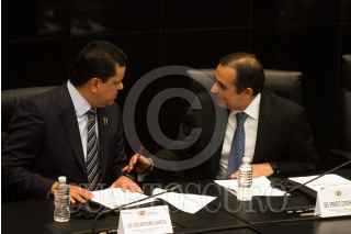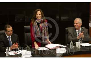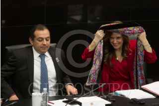 CIUDAD DE MÉXICO, 13FEBRERO2018.- Ernesto Cordero Arroyo, presidente de la Cámara de Senadores, y la diputada Teresa Jiménez-Becerril Barrio, co-presidenta de la Comisión Parlamentaria Mixta México-Unión Europea, durante la inauguración de la 24 Comisión Parlamentaria Mixta 2018, en la sede senatorial. FOTO: MOISÉS PABLO /CUARTOSCURO.COM