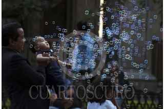 CUERNAVACA, MORELOS, 13FEBRERO2018.- Vida cotidiana de esta tarde en el zócalo de la ciudad, un bebe reacciona con las burbujas que un vendedor lanza. FOTO: MARGARITO PÉREZ RETANA /CUARTOSCURO.COM