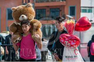 CIUDAD DE MÉXICO, 14FEBRERO2018.- Dos jóvenes caminan con regalos alusivos al día del amor y amistad afuera del metro Chapultepec. FOTO: DIEGO SIMÓN SÁNCHEZ /CUARTOSCURO.COM