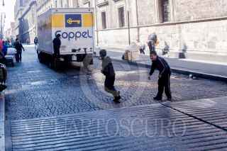 CIUDAD DE MÉXICO, 15FEBRERO2018.- Tres menores de edad juegan a treparse en la parte trasera de los camiones en movimiento que pasan por las calles de la capital. FOTO:TERCERO DÍAZ /CUARTOSCURO.COM