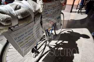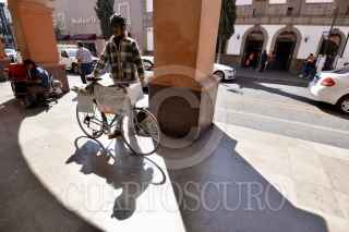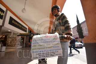 TOLUCA, ESTADO DE MÉXICO, 16FEBRERO2018. Originario de Ensenada, Baja California, Jesús Márquez, ha realizado cuatro recorridos por la República Mexicana en bicicleta, llevando un mensaje de Cultura de Paz y No Violencia, en cada una de las ciudades que visita permanece una semana y da pláticas en escuelas, a pesar de haber sido víctima de la delincuencia, no ha dejado de realizar está labor; pidiendo el apoyo de la ciudadanía para poder comprar medicina y alimentos y continuar con su mensaje de paz. FOTO: ARTEMIO GUERRA BAZ /CUARTOSCURO.COM