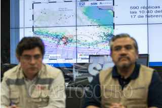 CIUDAD DE MÉXICO, 17FEBRERO2018.- Leonardo Ramírez Guzmán, del Instituto de Ingeniería, Hugo Delgado Granados, director del Instituto de Geofísica, Xyoli Pérez Campos, jefa del Servicio Sismológico Nacional, Luis Álvarez Icaza Longoria, director del Instituto de Ingeniería y Juan Carlos Montalvo Arrieta, de la Universidad Autónoma de Nuevo León, durante la conferencia para hablar sobre el sismo 7.2 con epicentro en la Pinotepa Nacional, Oaxaca. FOTO: ADOLFO VLADIMIR /CUARTOSCURO.COM