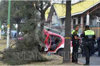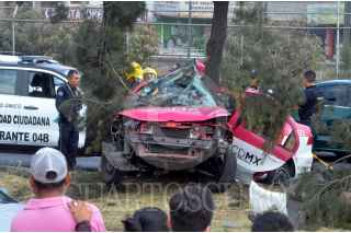 NEZAHUALCÓYOTL, ESTADO DE MÉXICO, 19FEBRERO2018.- Un taxi se estrelló contra un árbol en avenida Central a la altura del metro Impulsora resultando heridos tres hombres, la policía reportó que el percance se dio luego de que los tripulantes del taxi intentaron despojar a otra persona de su vehículo, suscitándose una persecución. FOTO: ARMANDO MONROY /CUARTOSCURO.COM