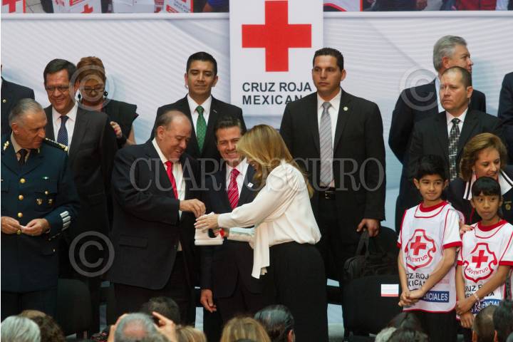 CIUDAD DE MÉXICO, 20FEBRERO2018.- Fernando Suinaga, presidente de la Cruz Roja; Enrique Peña Nieto, Presidente de México, y la primera dama Angélica Rivera, durante el inicio de la colecta de la Cruz Roja 2018 en el Palacio Nacional. FOTO: MOISÉS PABLO /CUARTOSCURO.COM