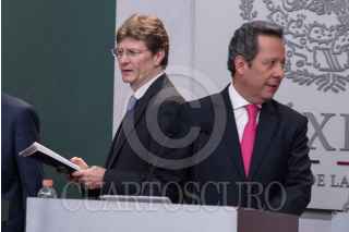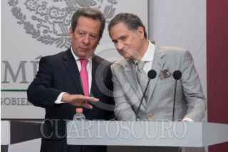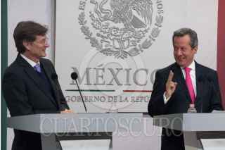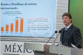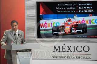 CIUDAD DE MÉXICO, 22FEBRERO2018.- Enrique de la Madrid, secretario de Turismo, y Eduardo Sánchez Hernández, vocero del Gobierno de la República, durante conferencia de prensa dieron a conocer los resultados de la derrama económica, impacto en medios y exposición global del Fórmula 1 Gran Premio de México 2017, el cual contribuyó a la economía del país con $8,400 millones de pesos, más $6,370 millones de pesos, valor de la exposición mediática global, que da como resultado $14,770 millones de pesos. FOTO: MARIO JASSO /CUARTOSCURO.COM