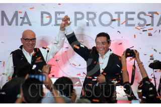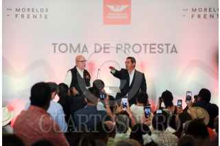 CUERNAVACA, MORELOS, 23FEBRERO2018.- El líder de Movimiento Ciudadano (MC) Dante Delgado alza la mano a Víctor Caballero, quien tomo protesta como candidato a la gubernatura de la entidad por el MC. FOTO: MARGARITO PÉREZ RETANA /CUARTOSCURO.COM