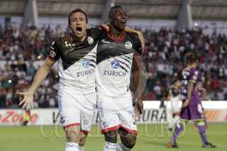 PUEBLA, PUEBLA, 24FEBRERO2018.- Los jugadores Jerónimo Amione y Julián Quiñones, festejan gol anotado durante el partido entre Lobos de la BUAP y los Tiburones de Veracruz con marcador final 5-0 a favor de los locales, correspondiente a la jornada 9 del torneo Clausura 2018 de la liga MX celebrado en el estadio olímpico universitario. FOTO: HILDA RÍOS / CUARTOSCURO.COM