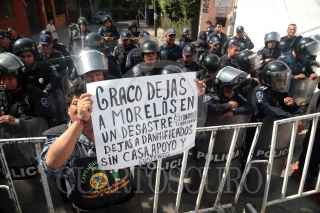 CUERNAVACA, MORELOS, 28FEBRERO2018.- Graco Ramírez Abreu, gobernador del estado de Morelos, inauguró el nuevo recinto legislativo de la entidad. El cual aun no esta terminado al cien por ciento. El libre tránsito alrededor del nuevo inmueble fue limitado por un operativo policiaco. Comerciantes del mercado Adolfo López Mateos se manifestaron por la obra, debido a que el nuevo congreso esta frente a su centro de trabajo y aseguran afectara sus ventas. Este corresponsal no pudo ingresar al evento oficial, ya que la Subdirectora de Comunicación Social, Gabriela Reynoso, no lo tenia en la lista de medios acreditados, y alegó que antes se debía presentar ante ella para ser tomado en cuenta. FOTO: MARGARITO PÉREZ RETANA /CUARTOSCURO.COM