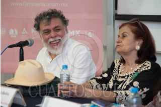 CIUDAD DE MÉXICO, 03MARZO2018.- El poeta jalisciense, Ricardo Yañez, y la poeta Patricia Medina, fueron homenajeados esta tarde en la 39 Feria Internacional del Libro (FIL) en el Palacio de Minería como parte del evento "Poéticas de Latitudes". FOTO: MARIO JASSO /CUARTOSCURO.COM