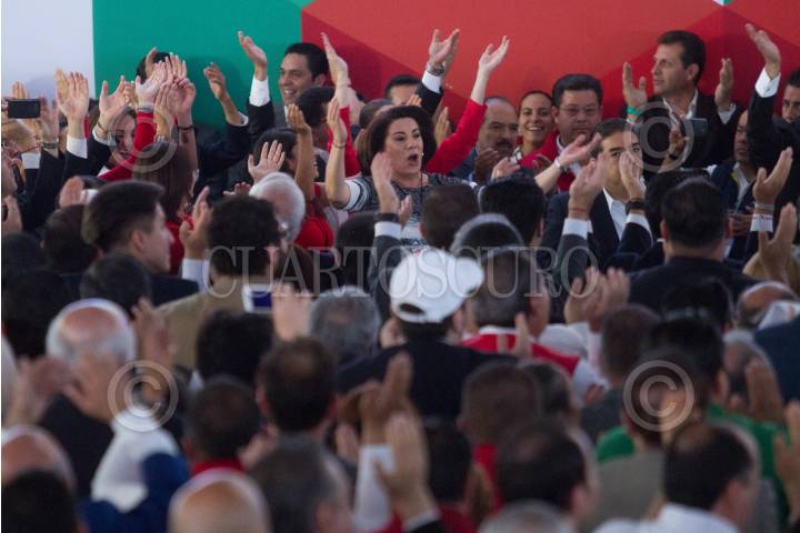 CIUDAD DE MÉXICO, 04FEBRERO2018.- Emilio Gamboa Patrón, Miguel Ángel Osorio Chong, y Manlio Fabio Beltrones, al finalizar la ceremonia del 89 aniversario del Partido Revolucionario Institucional, realizado en el CEN del PRI. FOTO: CUARTOSCURO.COM